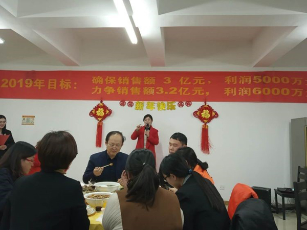 銷售部王云濤總,傾情提了四杯酒,敬董事長,敬自己,敬幕后人員。郝總代表大家為王總斟了一杯大酒,希望他2019年業(yè)績所向披靡,拿下5000萬目標(biāo)。他中招干了半杯,銷售酒量一般都是兩斤啊,神勇。后勤部王震山總勇猛做陪,一起炸了半杯。